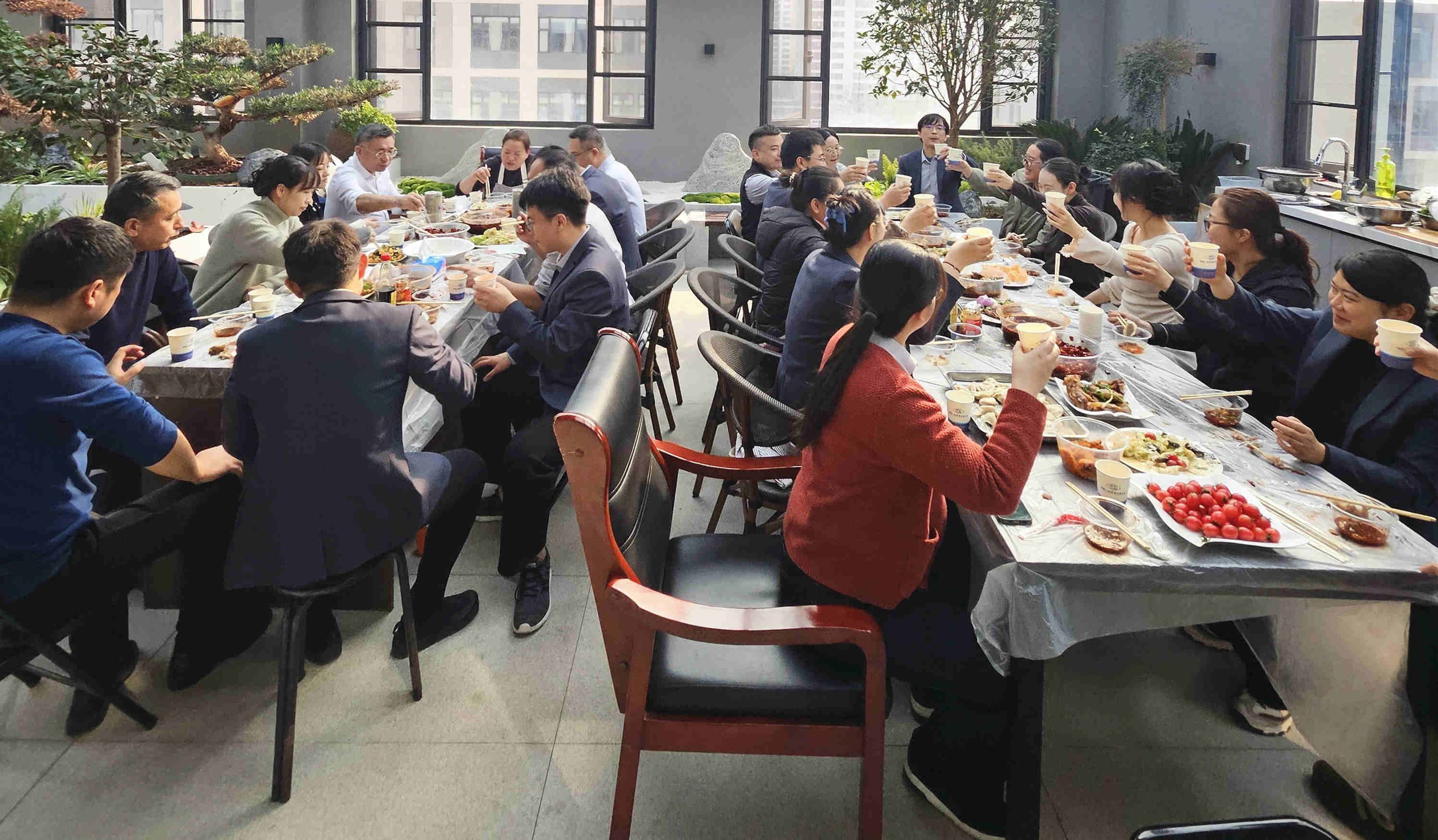 清水飘芙蓉,元宝落玉盘。热气腾腾的饺子陆续出锅,诱人的香气弥漫开来。员工们围坐在一起,品尝着亲手制作的美味成果,醋香、辣油各取所爱,咬一口饺子,暖意从舌尖直达心底,瞬间驱散了冬日的寒意。大家一边享用美食,一边分享工作趣事,这一刻,忙碌的工作压力烟消云散,取而代之的是节日的喜悦和满满的归属感。
