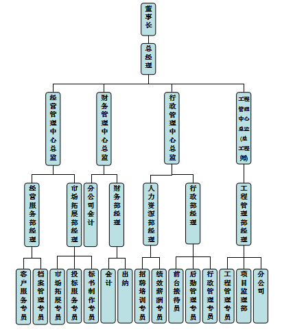 公司按照现代企业管理模式,建立了科学高效的组织机构,现设“一办一部四乐竞(中国)”,即总经办、综合部、工程管理乐竞(中国)、人力资源管理乐竞(中国)、经营管理乐竞(中国)、财务管理乐竞(中国)。